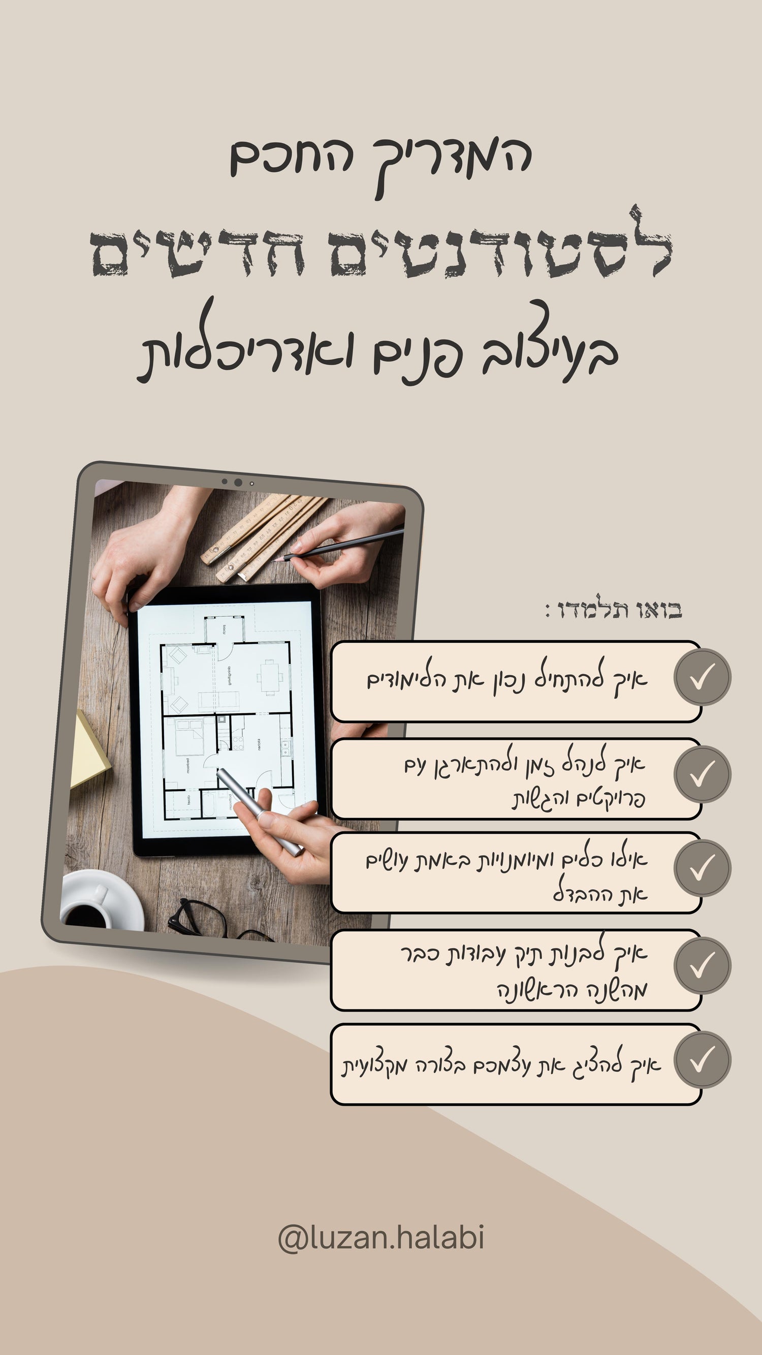 המדריך בנוי בצורה ברורה ופרקטית, עם כל מה שסטודנט צריך לדעת כדי להתחיל נכון ולהצליח.